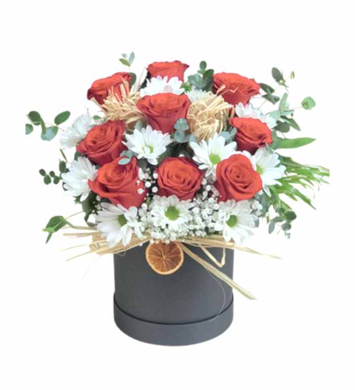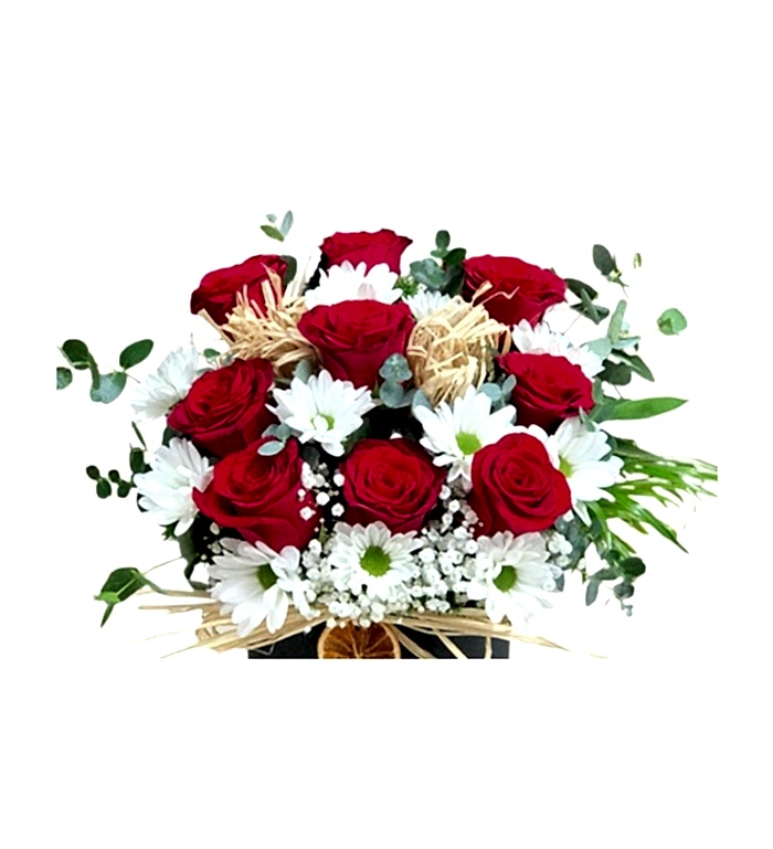 Özel anlarınızı taçlandıracak, zarafeti ve doğallığı bir arada sunan "Kutuda Kırmızı Gül" ile sevdiklerinize unutulmaz bir sürpriz yapın. Kutuda yer alan özenle seçilmiş kırmızı güller, aşkın ve tutkunun simgesi olarak her duyguyu derinlemesine ifade eder. Güllerin etrafını saran zarif papatyalar ve yeşillikler, bu güzel tasarımı tamamlayarak doğanın taptaze dokunuşlarını hediyenize katıyor. Bu eşsiz çiçek aranjmanı, sevgi dolu anlarınızı daha da özel kılacak.