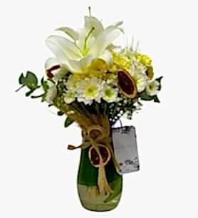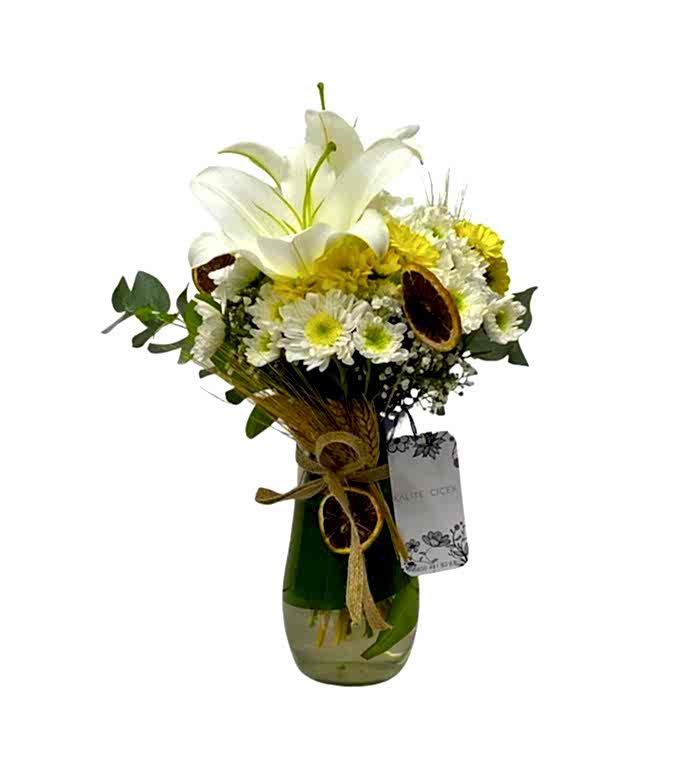 Merhaba! North Miami, taze ve kaliteli beyaz lilyum, sarı beyaz papatyalar, cipso ve okaliptüsler ile yeşilliklerle süslendi ve zarif bir cam vazo ile tasarlandı. Bu muhteşem aranjman, sevdikleriniz için mükemmel bir hediye seçeneği!
