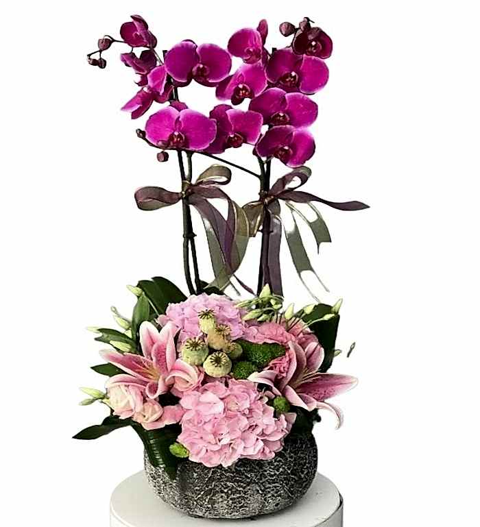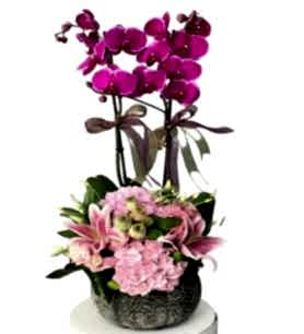 Çiçek orkide tasarım ekibimizce dekoratif kabak seramik içinde hazırlanan Royal Purple orkide ürünümüz 2 dal mor orkide, 2 adet pembe lilyum, 2 adet pembe ortanca, 2 adet pembe gül ve 3 adet pembe lisyantus ile tasarlandı, kurdeleler ve yeşil biçme ile süslendi Sempatik ve göz alıcı görüntüsü farklı tasarımı ile ona özel olduğunu hissettirecek ve onu mutlu etmek için çok hoş bir sürpriz olacak.