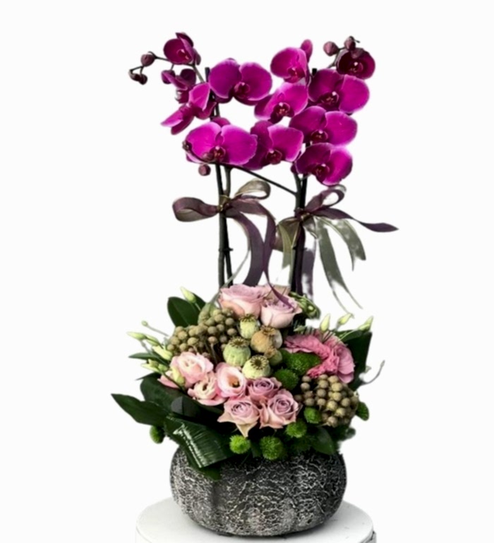 Orkide tasarım ekibimizce hazırlanan Special purple Orkide dekoratif seramik içinde haşhaş kandilleri ve kurdela ile süslenen; iki dal mor orkide, 6 adet lila gül, 6 adet pembe lisyantus ile tasarlanmıştır. şık ve sade görüntüsü asil duruşu ile ev ve ofislerinizin masalarını güzelleştirecek, sevdikleriniz için duygularınıza tercüman olacak güzel dilekleriniz için harika bir hediye olacaktır.