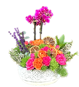 Bu muhteşem tasarım, çift dallı mini orkide çiçeği, turuncu ve pembe çardak gülleri, lavanta ve dekoratif kuru limonlar gibi özel malzemeler kullanılarak hazırlanmıştır. En sevdiğiniz insanın gönlünü fethetmek için mükemmel bir hediye seçeneği olan bu çiçek tasarımı, evde veya ofiste harika bir atmosfer yaratacak.