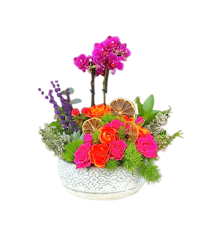 Sevgili müşterilerimiz, sizin için harika bir hediye seçeneği hazırladık! Dekoratif saksıda iki dallı mini orkide çiçeği, çardak gülleri, lavanta ve dekoratif kuru limonlar ile hazırlanan çiçek tasarımımız, sevdikleriniz için en özel hediyelerden biri olacak.