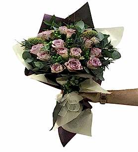 Mor güller, aşkı ve tutkuyu simgelerken, yeşil biçme okaliptüs ise doğal bir tazelik ve ferahlık hissi veriyor. | Kalite Çiçek