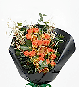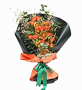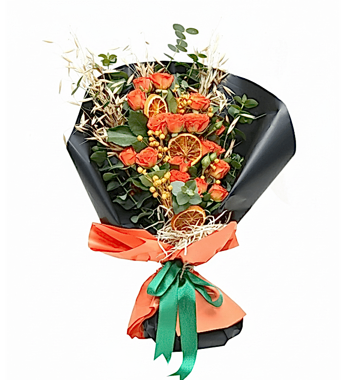 Canlı Turuncu Çardak Gülü Buketi – Kuru Limon ve Doğal Yeşilliklerle Süslenmiş