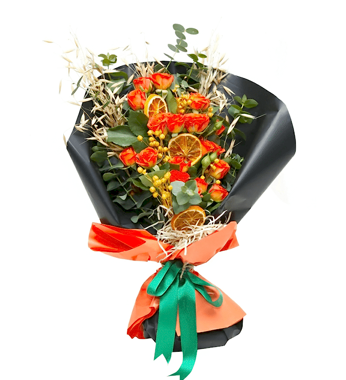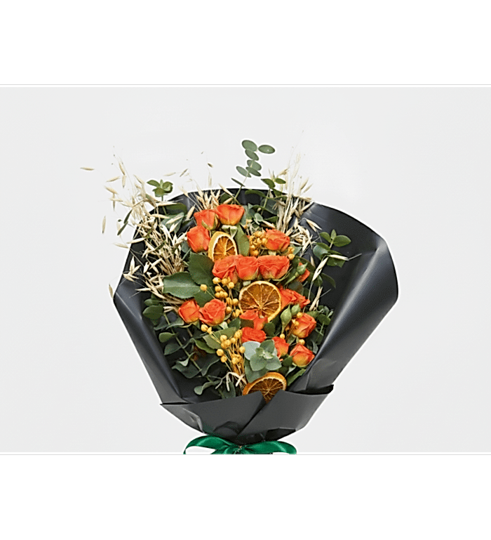 Bu eşsiz turuncu çardak gülü buketi, her ortama sıcaklık ve neşe katmak için tasarlandı. Canlı turuncu güllerin büyüleyici renkleri, özenle seçilmiş kuru limon dilimleriyle ve doğal yeşilliklerle harmanlanarak görsel bir şölen sunuyor. Sevdiklerinize gönderebileceğiniz veya evinizin en güzel köşesini süsleyebileceğiniz bu özel buket, tazeliği ve zarafeti bir araya getiriyor.