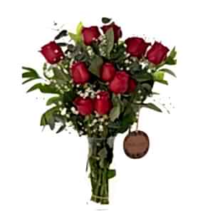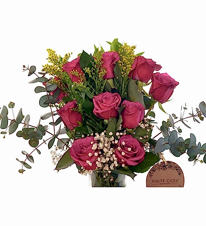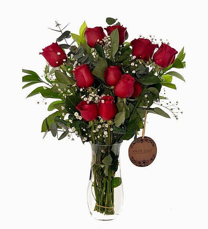 Vazoda 10’lu Koyu Kırmızı Gül, 10 adet kırmızı gülün bir buket halinde vazoya yerleştirilmesiyle oluşturulan oldukça güzel bir üründür. Güller en çok beğenilen en çok tercih edilen çiçek türleri arasındadır. Koyu kırmızı renkleriyle kadınların beğenisini kazanmışlardır ve koyu kırmızı renkleri aynı zamanda sevgiyi tasvir etmektedir. Ürün için cam vazo kullanılmıştır.
